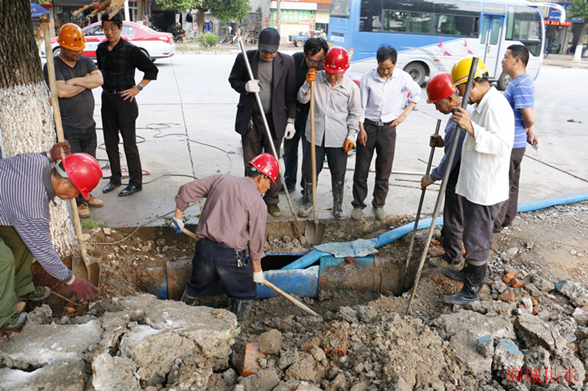 我公司接报后,立即组织供水抢修队赶赴现场,抢险人员迅速关闭了供水阀门,启动《供水应急抢险预案》,火速投入到紧张的抢险中。受地形因素制约,只能人工开挖,这无疑加大了工作量,经过连续5个小时的奋力抢修,于晚上8点30分将爆裂的管网更换完毕,恢复了正常供水。