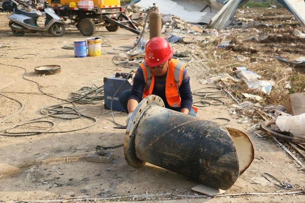 由于破损管径太大,管内余水仍存在压力,出水量很大导致无法迅速排水,基坑里水位较高,且基坑较高存在塌方隐患,给抢修工作带来很大的困难。在施工现场负责人调整了施工方案后,安装公司尤忠祥等一批老党员同志主动请缨,甚至光着膀子就直接进入泥泞的竖井抢修区开始管道清淤、抽水和焊接修复等工作。