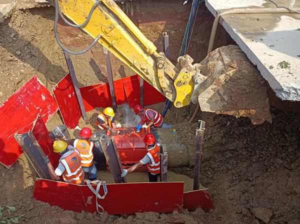安装公司接到抢修任务后,立即启动抢维修二级应急预案,现场制定抢修和安全防护方案。上午7时,安装公司出动大型挖机1台对漏水点进行开挖,由于原水管线深埋地下约3米,开挖难度较大且易出现基坑四周二次坍塌的的危险。为保障在有限空间内安全施工,现场施工人员充分做好深基坑支护工作。经过近4个小时的开挖、排水、清理,漏水点具备抢修条件,工作人员用定制的哈夫节将漏点管网紧紧包裹,在仔细检查所有螺丝接口,确保没有一处渗水后,现场开始回填基坑,恢复路面。