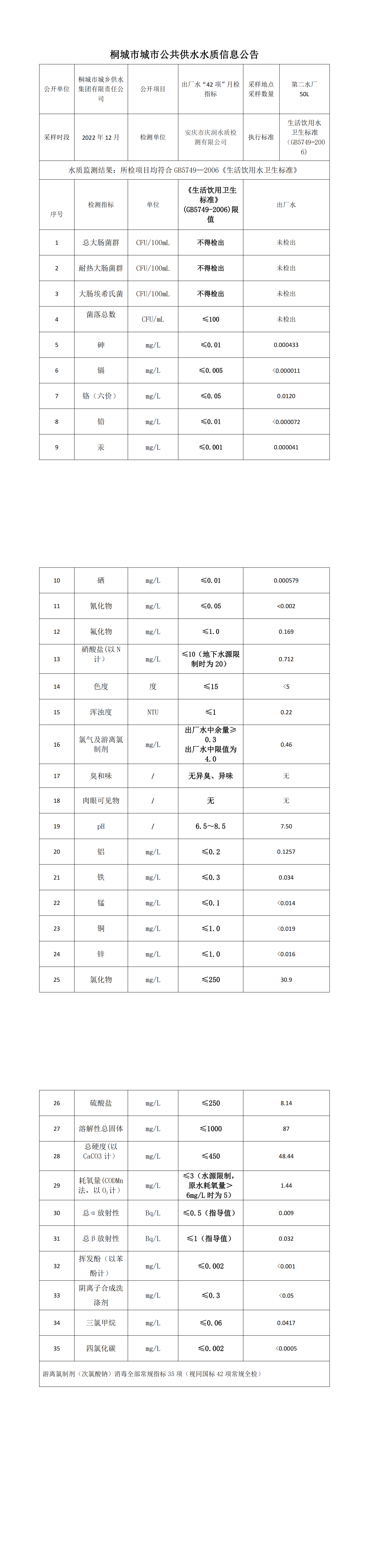 桐城市城市公共供水水质信息公告(2022年12月 42项)
