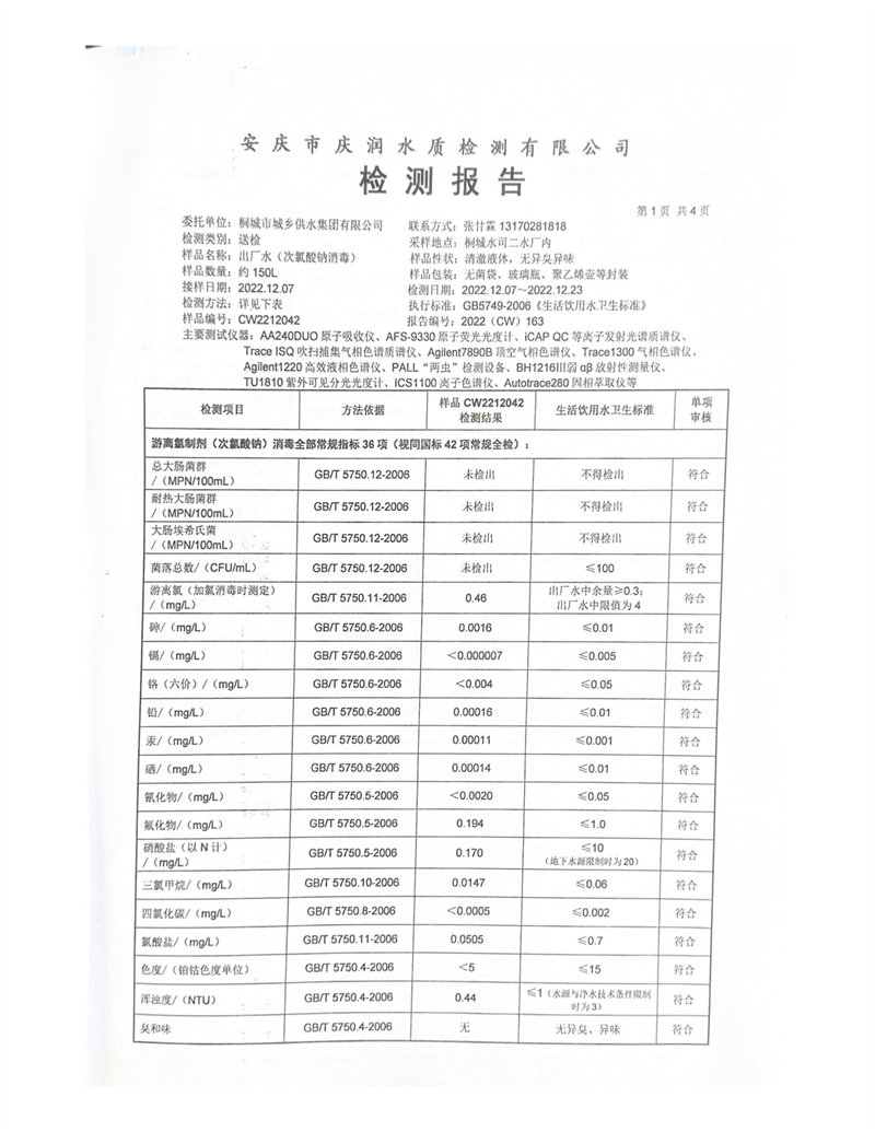 桐城市城市公共供水水质信息公告(2022年12月 42项)