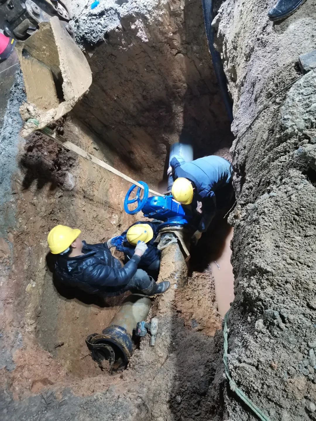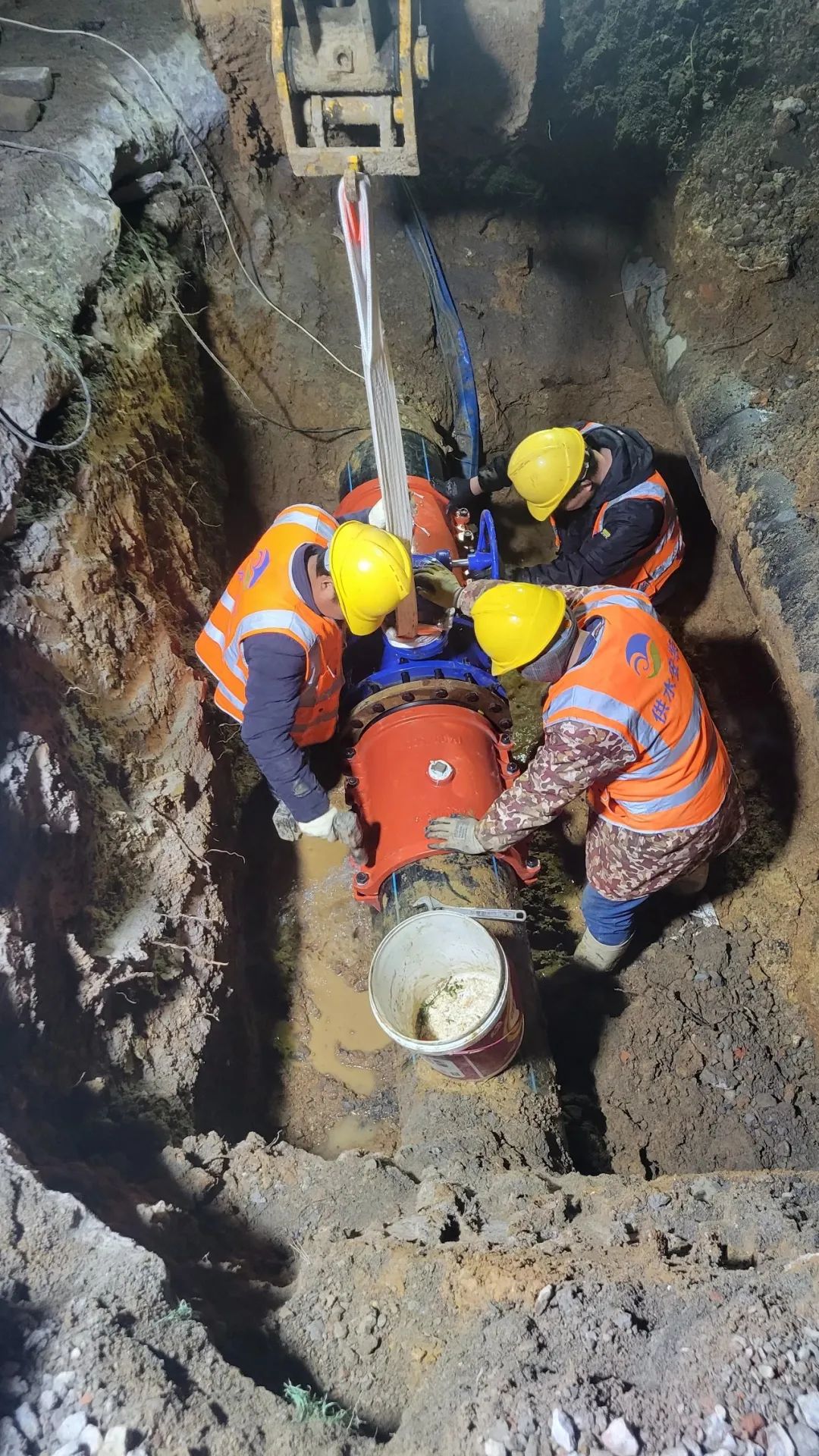 同时为确保工程顺利竣工,早日实现城乡供水同网同质的目标。3月21日夜间,管线施工单位市城乡市政工程安装有限公司冒雨在范岗镇DN300供水主管网上加装阀门,为下步城乡供水管网连通奠定基础。